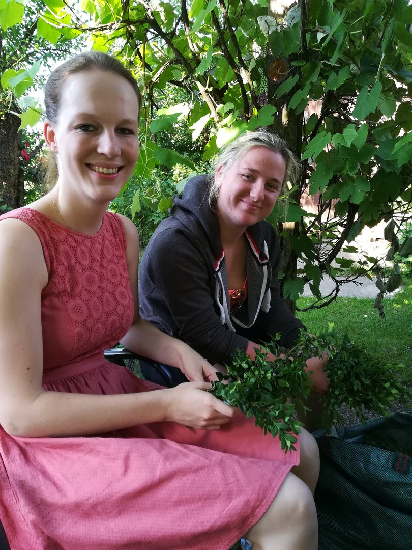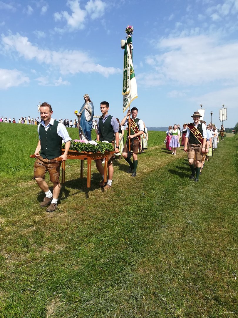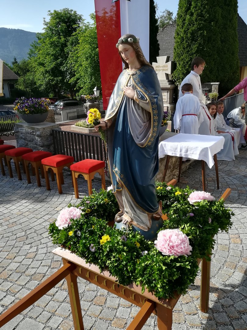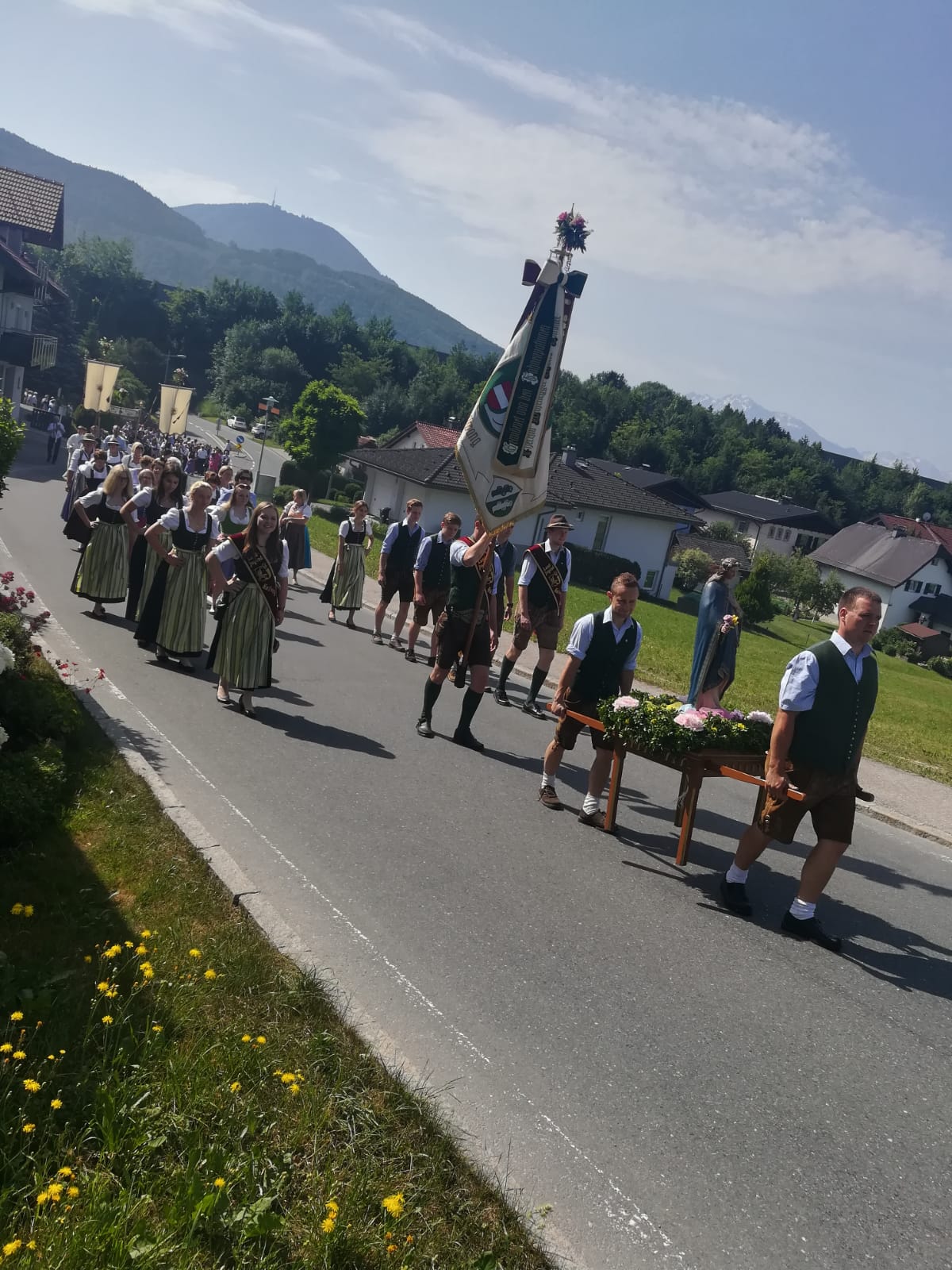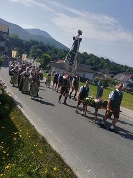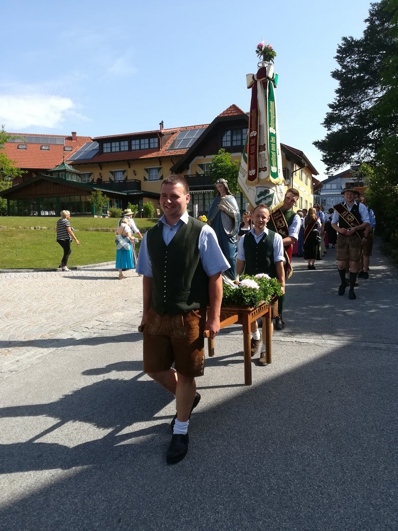 Am 31. Mai 2018 waren wir bei der Fronleichnamsprozession in Hallwang dabei. Unsere Mädels haben am Vorabend den Buchskranz für die Marienstatue gebunden. Danach wurde der Kranz noch mit Blumen geschmückt und bei dem Umzug haben wir die Marienstaute durch den Ort getragen.