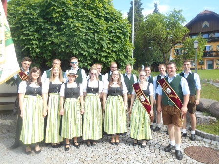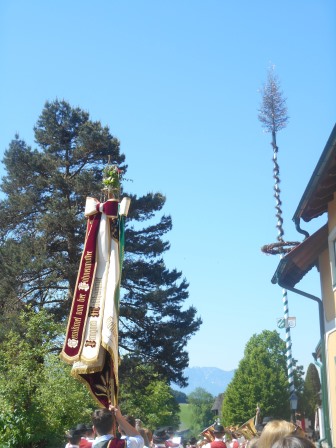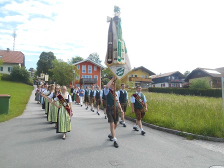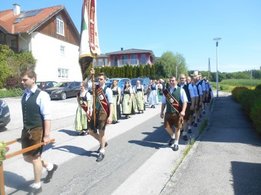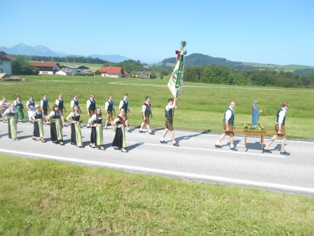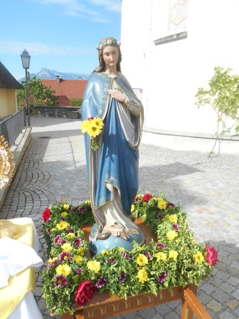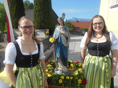 Am 26. Mai fand bei uns in Hallwang das Fronleichnamsfest statt. Alle Vereine nahmen mit den Fahnen an der Prozession teil. Wie es zur Tradition gehört, wird auch eine Marienstatue mitgetragen. Diese wurde von der Landjugend zuerst geschmückt und dann von unseren kräftigen Männern getragen.