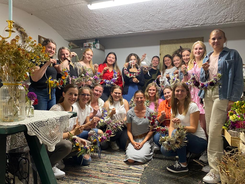 Zuerst haben wir draußen am Feld selbst ein paar Blumen gepflückt und diese dann später mit weiteren in einen Loop verarbeitet.