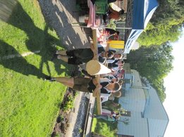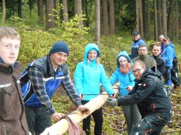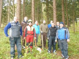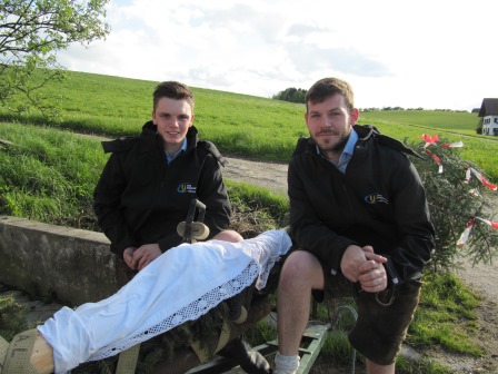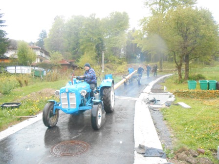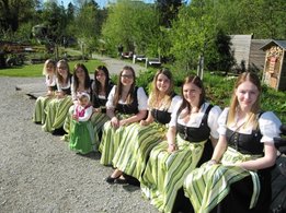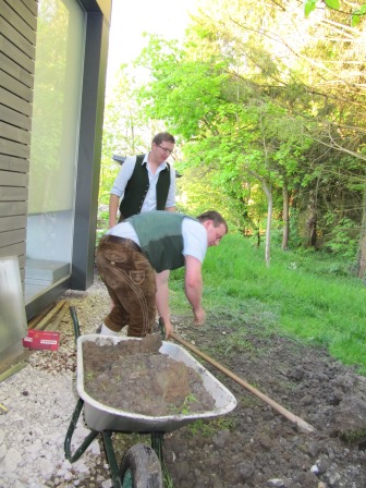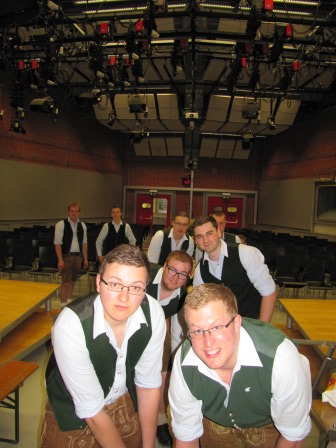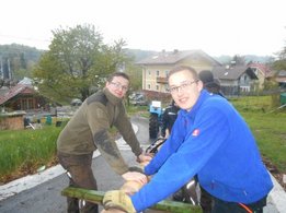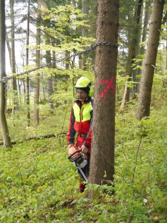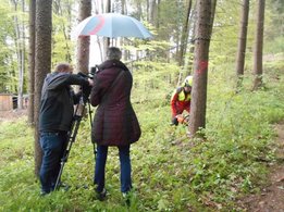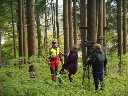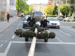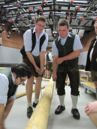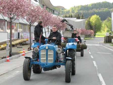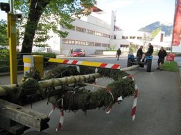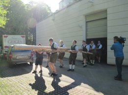 Die Vorbereitungen für diesen einzigartigen Maibaum begannen schon einige Tage im Voraus. Als erstes wurden ein Kranz und eine Girlande aus Tannenzweigen gebunden, sodass der Baum traditionell geschmückt werden konnte. Außerdem gehörte es zu unseren Aufgaben ein Maibaumloch im Fernsehgarten zu graben, das nach einem kleinen Malheur mit einem Kabel ordnungsgemäß fertig gegraben wurde. Doch das wichtigste, der Baum an sich, musste noch gefällt werden. Vier Tage vor dem Aufstellen machten wir uns samt ORF Kamerateam auf in den Wald und suchten einen passenden Baum vom Goisnbauer aus. Bald hatten wir einen gefunden, der dann forst- und kameragerecht gefällt sowie geschepst (geschält) wurde. Zwischengelagert wurde unser ORF-Schatz im Heuboden, bevor ihn unsere Burschen durch die Stadt zum Landesstudio bringen konnten. Dort wurde er in einem Fernsehstudio verwahrt, das sonst Platz für viele ZuschauerInnen bzw. ZuhörerInnen verschiedener ORF Sendungen bietet. Zwei Mädls von uns, Andrea und Maria, durften in der Woche vor dem großen ORF Maibaumfest auch zu Philipp Meikl in die Live – Radiosendung am Abend kommen.
